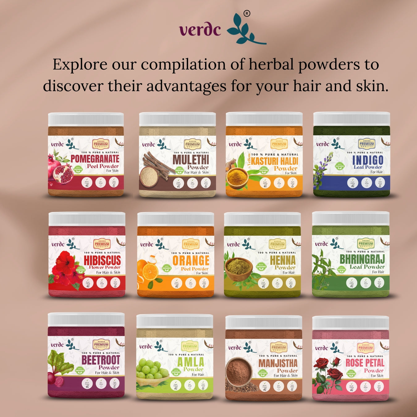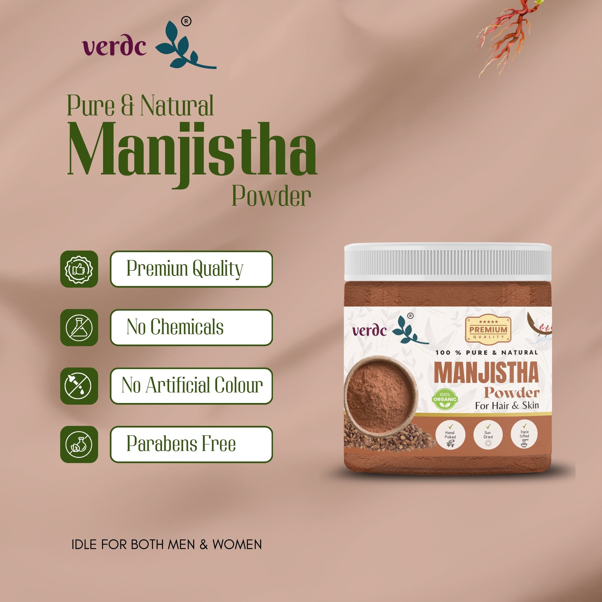 Manjistha powder is derived from the roots of the Rubia cordifolia plant, commonly known as Indian Madder. It is widely used in traditional Ayurveda for its benefits, particularly for skin and hair care. verdc Manjistha/Indian Madder Powder is an excellent skin brightening agent, fights with skin problems like acne and pimples. Manjistha/Rubia Cordifolia pack acts as a hair treatment and keeps all hair problems at bay. The anti-inflammatory properties of manjistha helps in reducing and preventing skin rashes and infections. It inhibits the damage caused by bacteria. It is an effective natural remedy for both the skin and the hair.