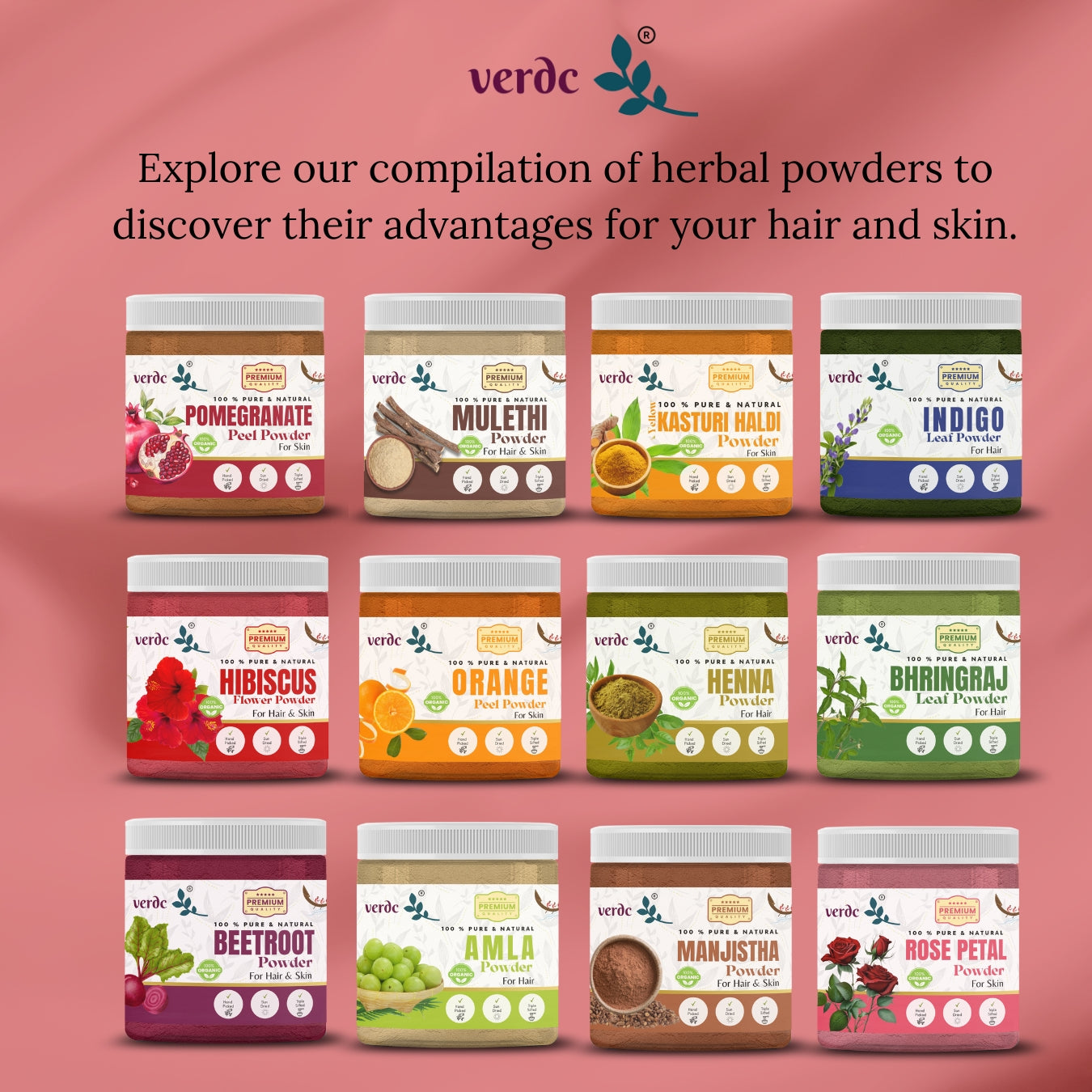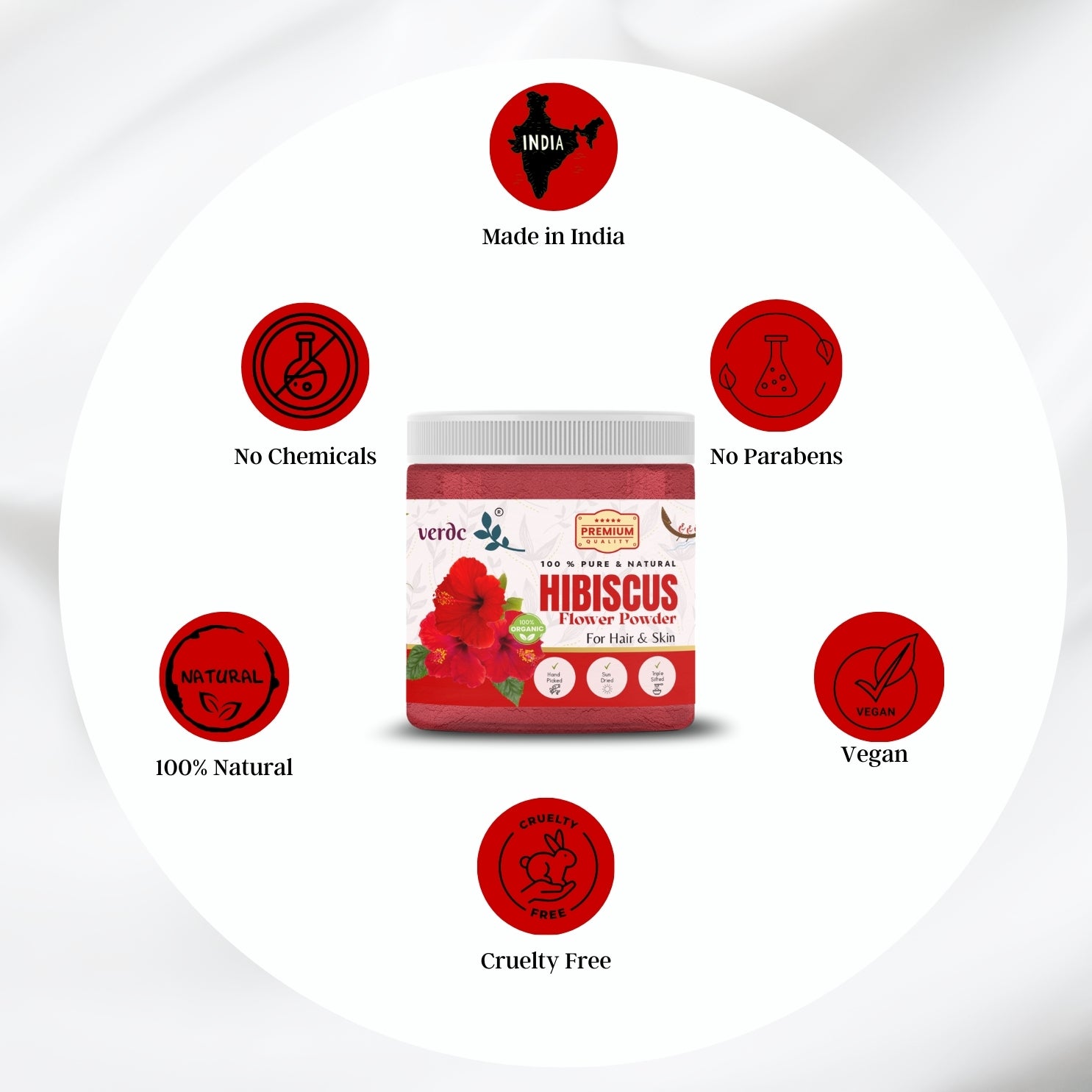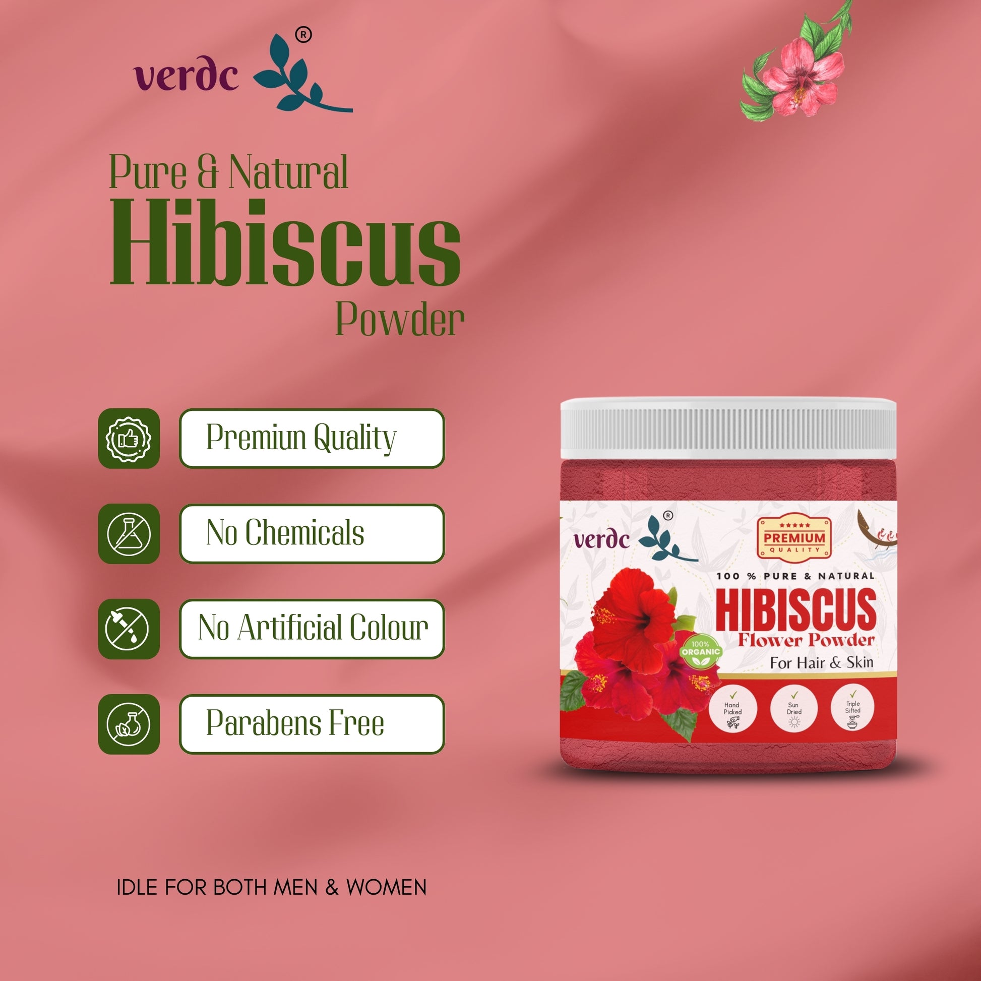 Hibiscus powder is made from the dried petals of the hibiscus flower, known for its vibrant color and numerous health benefits. verdc Hibiscus powder is a 100% pure and natural herbal powder made out of freshly plucked hibiscus flowers organically grown in selected Kerala farms.. Our farm-fresh, handpicked and natural sun dried hibiscus powder heals multiple common skin and hair related issues like skin ageing (fine lines and wrinkles), premature greying, dullness, rough hair, dryness, suntan, hair damage, and many more.